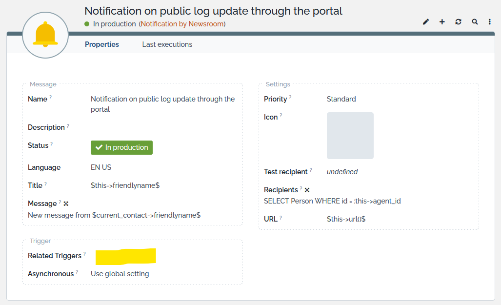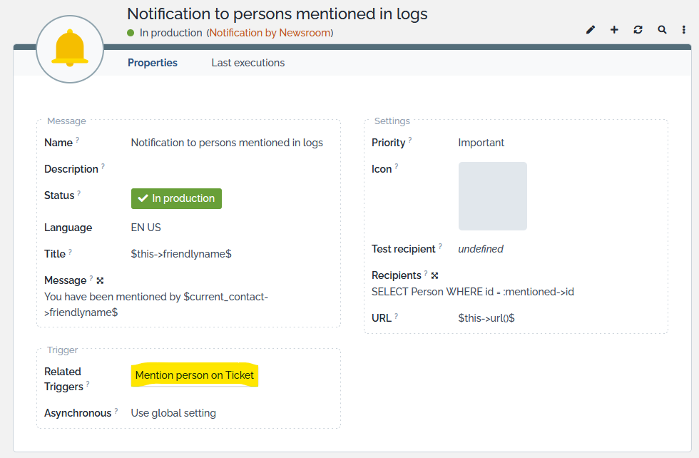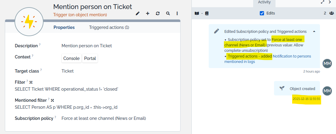 • One Notification to persons mentioned in logs automatically linked to all your existing “Trigger (on object mention)” searching for “Person” in the filed “Mentioned filter”