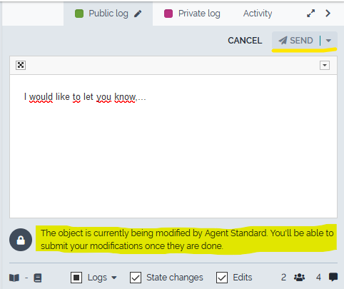 If a user enter some text or just try to edit a caselog in the activity panel of an object currently under edition, or simply under caselog edition by another user, then the first user receive a small message to let him know that he will only be able to submit his entries once the other user will have finished. Notice that the