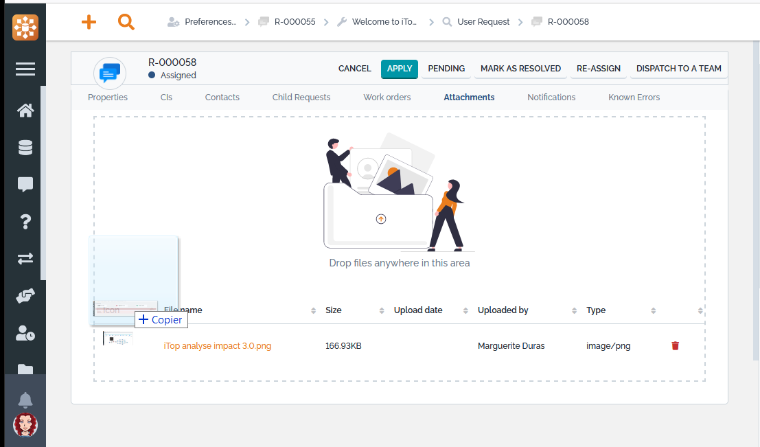 Attachments allow to upload a document (any file or image) into iTop and “attach” it to a given object in iTop. This is very similar to email attachments.