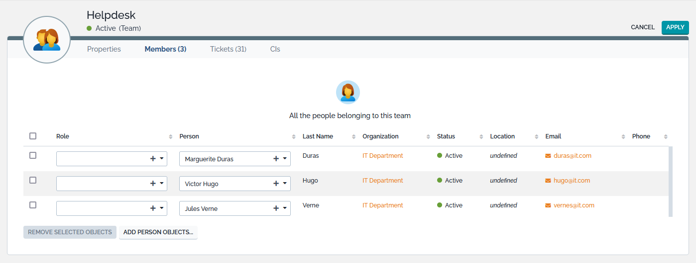 For example, the tab Teams displays all the teams for which the selected person is a member of. The Tickets tab displays the tickets for which the selected person is the requester.