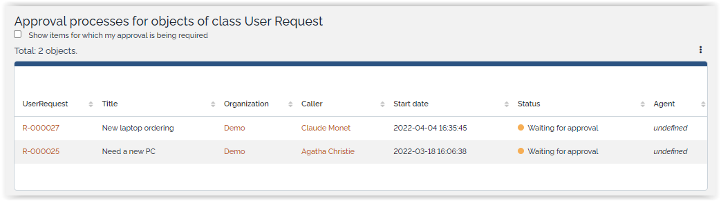 The page shows a list of the User Requests having an approval process running, and for which your approval is being requested: