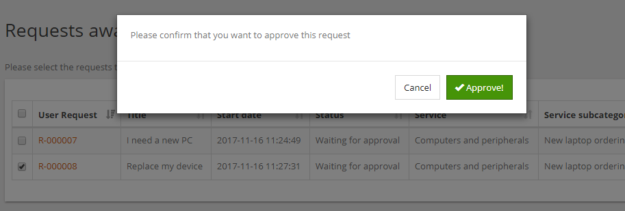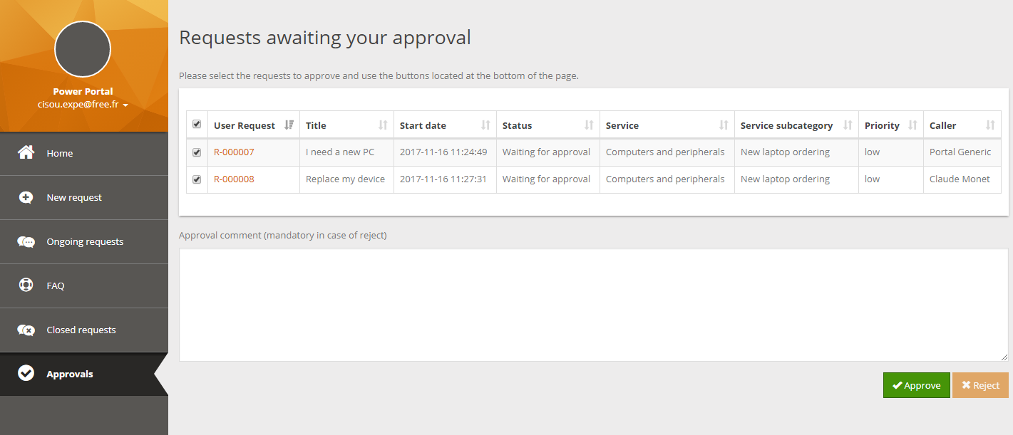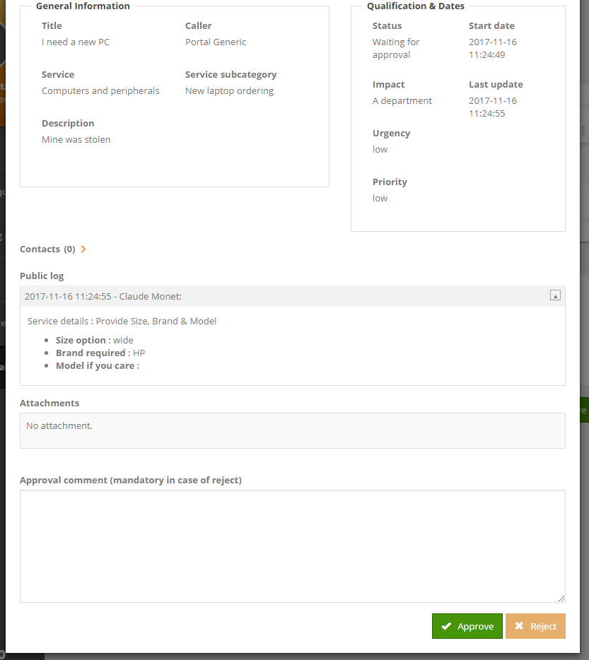 Then the User Request enters the state Waiting for approval and a notification is sent to the Approver. The Approver can approve or reject the request by clicking on the link provided in the email (an iTop login is not mandatory for this action). Alternatively, she can approve or reject from within iTop.