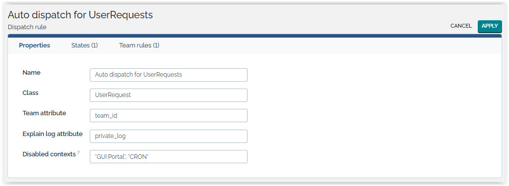 | Disabled contexts | Optional | A CSV list of context tags in which the Dispatch rule will be inactive. Typically a portal (“GUI:Portal”), cron tab (“CRON”), a rest/json call (“REST/JSON”), … |