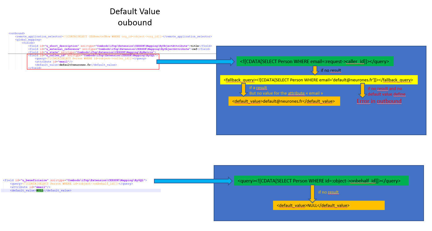 <module_design id="case-exchange" _delta="must_exist"> <remote_applications> <remote_application id="DefaultCEXRemoteiTop" xsi:type="CEXRemoteiTop" _delta="define"> <global> <inbound> <operations> <operation id="itop-message/hand-shake" xsi:type="Combodo\iTop\Extension\CEXiTop\Service\CEXIncomingMessageHandShake"/> <operation id="itop-message/add-attachment" xsi:type="Combodo\iTop\Extension\CEXSDK\Incoming\Message\AddAttachment"/> <operation id="itop-message/del-attachment" xsi:type="Combodo\iTop\Extension\CEXSDK\Incoming\Message\DelAttachment"/> </operations> </inbound> </global> <synchronized_classes> <synchronized_class id="UserRequest"> <inbound> <global_mapping> <object_attributes> <!-- How the local synchronized object attributes are mapped from the received message fields --> <attribute id="agent_id" xsi:type="Combodo\iTop\Extension\CEXSDK\Mapping\ByOQL"> <query><![CDATA[SELECT Person WHERE email=:remote->agent_id AND email != '']]></query> <args> <arg id="remote->agent_id"> <remote_field id="agent_id"/> <description>Agent email</description> </arg> </args> </attribute> <attribute id="caller_id" xsi:type="Combodo\iTop\Extension\CEXSDK\Mapping\ByOQL"> <query><![CDATA[SELECT Person WHERE email=:remote->caller_id AND email != '']]></query> <fallback_query><![CDATA[SELECT Person WHERE email='claude.monet@demo.com']]></fallback_query> <args> <arg id="remote->caller_id"> <remote_field id="caller_id"/> <description>Caller email</description> </arg> </args> </attribute> <attribute id="description" xsi:type="Combodo\iTop\Extension\CEXSDK\Mapping\ByRemoteField">description</attribute> <attribute id="escalation_flag" xsi:type="Combodo\iTop\Extension\CEXSDK\Mapping\ByRemoteField">escalation_flag</attribute> <attribute id="escalation_reason" xsi:type="Combodo\iTop\Extension\CEXSDK\Mapping\ByRemoteField">escalation_reason</attribute> <attribute id="impact" xsi:type="Combodo\iTop\Extension\CEXSDK\Mapping\ByMatrix"> <remote_field id="impact"/> <description>Impact value: 1, 2 or 3</description> <values> <value id="1">3</value> <value id="2">2</value> <value id="3">1</value> </values> </attribute> <attribute id="org_id" xsi:type="Combodo\iTop\Extension\CEXSDK\Mapping\ByOQL"> <query><![CDATA[SELECT Organization WHERE name=:remote->org_id]]></query> <args> <arg id="remote->org_id"> <remote_field id="org_id"/> <description>Organization name</description> </arg> </args> </attribute> <attribute id="origin" xsi:type="Combodo\iTop\Extension\CEXSDK\Mapping\ByRemoteField"> <remote_field id="origin"/> <description>call origin (phone,...)</description> </attribute> <attribute id="parent_request_id" xsi:type="Combodo\iTop\Extension\CEXSDK\Mapping\ByOQL"> <query><![CDATA[SELECT UserRequest WHERE remote_ref=:remote->parent_request_id AND remote_ref != '']]></query> <args> <arg id="remote->parent_request_id"> <remote_field id="parent_request_id"/> <description>Parent ticket reference</description> </arg> </args> </attribute> <attribute id="pending_reason" xsi:type="Combodo\iTop\Extension\CEXSDK\Mapping\ByRemoteField">pending_reason</attribute> <attribute id="private_log" xsi:type="Combodo\iTop\Extension\CEXSDK\Mapping\ByRemoteField">private_log</attribute> <attribute id="public_log" xsi:type="Combodo\iTop\Extension\CEXSDK\Mapping\ByRemoteField">public_log</attribute> <attribute id="remote_ref" xsi:type="Combodo\iTop\Extension\CEXSDK\Mapping\ByRemoteField">ref</attribute> <attribute id="request_type" xsi:type="Combodo\iTop\Extension\CEXSDK\Mapping\ByRemoteField">request_type</attribute> <attribute id="resolution_code" xsi:type="Combodo\iTop\Extension\CEXSDK\Mapping\ByRemoteField">resolution_code</attribute> <attribute id="service_id" xsi:type="Combodo\iTop\Extension\CEXSDK\Mapping\ByOQL"> <query><![CDATA[SELECT Service WHERE name=:remote->service_id]]></query> <args> <arg id="remote->service_id"> <remote_field id="service_id"/> <description>Service name</description> </arg> </args> </attribute> <attribute id="servicesubcategory_id" xsi:type="Combodo\iTop\Extension\CEXSDK\Mapping\ByOQL"> <query><![CDATA[SELECT ServiceSubcategory WHERE name=:remote->servicesubcategory_id]]></query> <args> <arg id="remote->servicesubcategory_id"> <remote_field id="servicesubcategory_id"/> <description>Service sub-category name</description> </arg> </args> </attribute> <attribute id="solution" xsi:type="Combodo\iTop\Extension\CEXSDK\Mapping\ByRemoteField">solution</attribute> <attribute id="team_id" xsi:type="Combodo\iTop\Extension\CEXSDK\Mapping\ByOQL"> <query><![CDATA[SELECT Team WHERE name=:remote->team_id]]></query> <args> <arg id="remote->team_id"> <remote_field id="team_id"/> <description>Team name</description> </arg> </args> </attribute> <attribute id="title" xsi:type="Combodo\iTop\Extension\CEXSDK\Mapping\ByRemoteField">title</attribute> <attribute id="urgency" xsi:type="Combodo\iTop\Extension\CEXSDK\Mapping\ByMatrix"> <remote_field id="urgency"/> <description>Urgency level: 1 to 4</description> <values> <value id="1">1</value> <value id="2">2</value> <value id="3">3</value> <value id="4">4</value> </values> </attribute> <attribute id="user_satisfaction" xsi:type="Combodo\iTop\Extension\CEXSDK\Mapping\ByRemoteField">user_satisfaction</attribute> <attribute id="user_comment" xsi:type="Combodo\iTop\Extension\CEXSDK\Mapping\ByRemoteField">user_comment</attribute> </object_attributes> <link_attributes> <!-- How the local to remote link attributes are mapped from the received message fields --> <attribute id="source_key" xsi:type="Combodo\iTop\Extension\CEXSDK\Mapping\ByRemoteField">source_key</attribute> <attribute id="source_fname" xsi:type="Combodo\iTop\Extension\CEXSDK\Mapping\ByRemoteField">source_fname</attribute> <attribute id="source_class" xsi:type="Combodo\iTop\Extension\CEXSDK\Mapping\ByConstant">UserRequest</attribute> </link_attributes> <remote_fields> <!-- How the fields for the response to the remote system are mapped from the local synchronized object --> <field id="agent_id" xsi:type="Combodo\iTop\Extension\CEXSDK