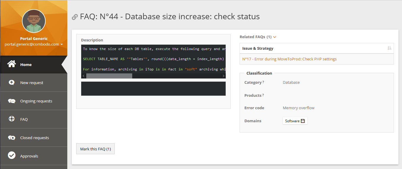 Allow a agent to tag a Ticket as candidate for writing a FAQ documenting the issue of the Ticket (User Request, Incident, Change, Problem). The action of creating a FAQ based on a User Request is part of the Problem Management.