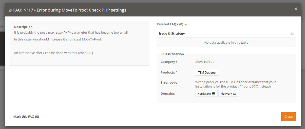'combodo-faq-advanced' => array ( 'faq-attribute-to-search' => 'key_words', // or description or error_code 'combine-keywords' => 'yes', // yes="All keywords required", no = "at least one" 'compute-related-faqs' => 'yes', // default no, parse description to retrieve FAQ pointed in the text and link them explicitly ),
