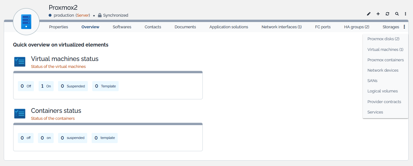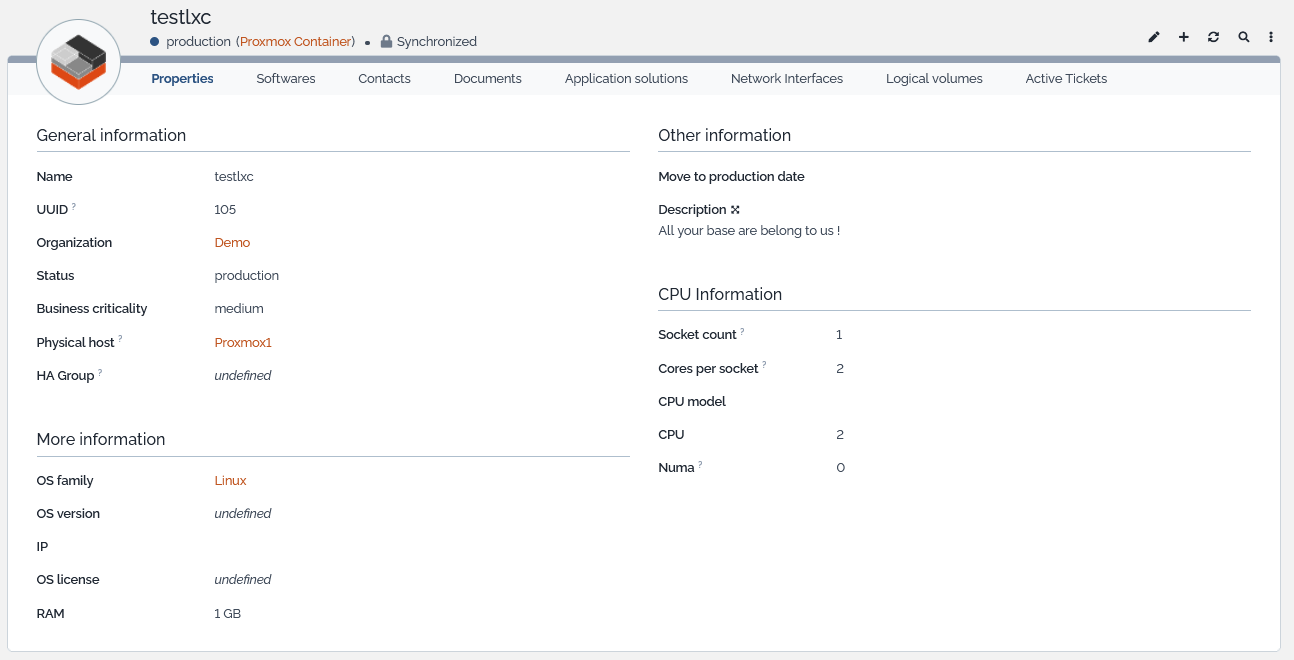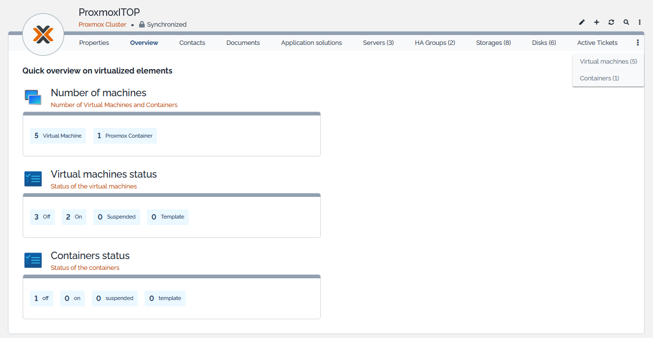 This extension is dedicated to Proxmox, the server virtualization platform that automates the management of virtual machines. It enhances iTop's CMDB by modelizing Proxmox elements that are not part of iTop's default CIs (Clusters, Storage, Containers…) and by adding attributes to some of the existing devices (Servers, Virtual Machines). Combined with the Data collector for Proxmox, it allows Proxmox administrators to fetch in iTop the key elements of their Proxmox infrastructure.
