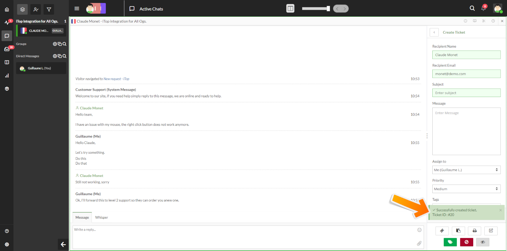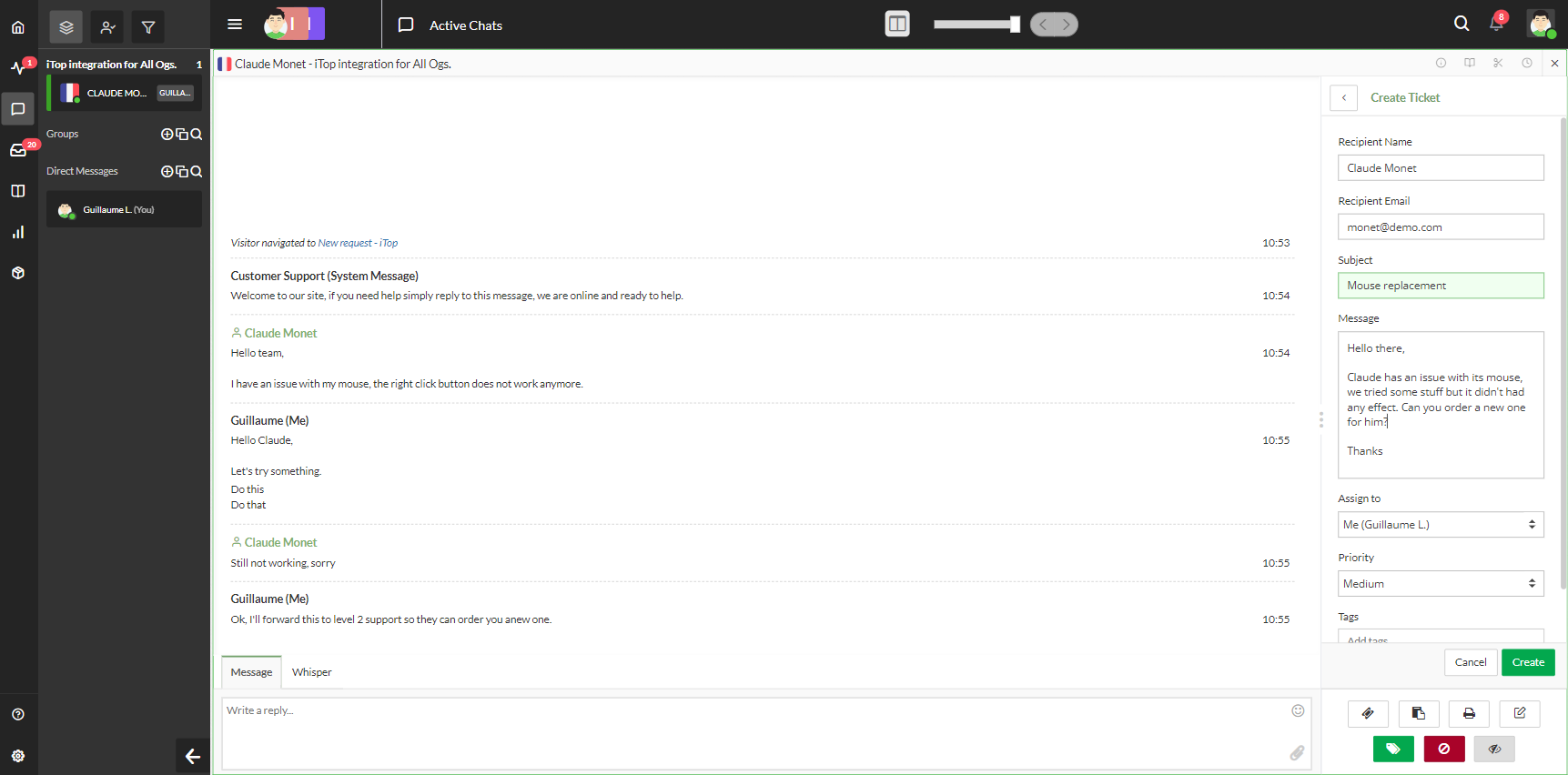 Allow support agents to create a ticket in iTop directly from their tawk.to chat dashboard