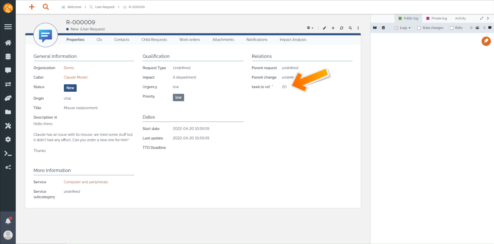 tawk.to ticket's reference is also set in the iTop's ticket for