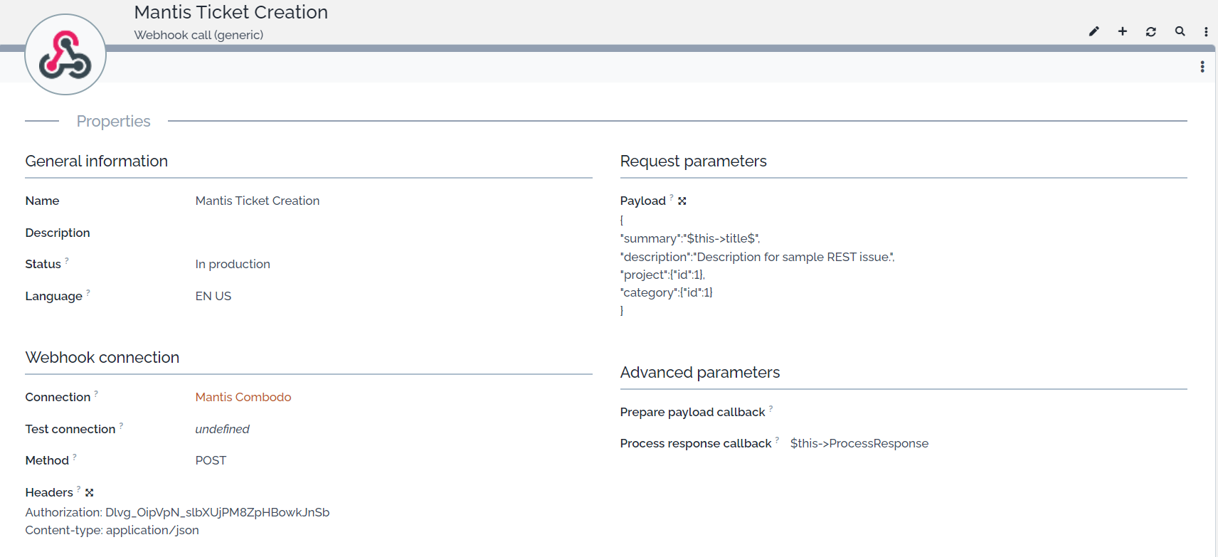| Path | Additional path to append to the connection URL (eg. '/some/specific-endpoint/$this->any_attribute$') where $this->any_attribute$ corresponds to any attribute of the object that trigger the vent, for instance a ticket |