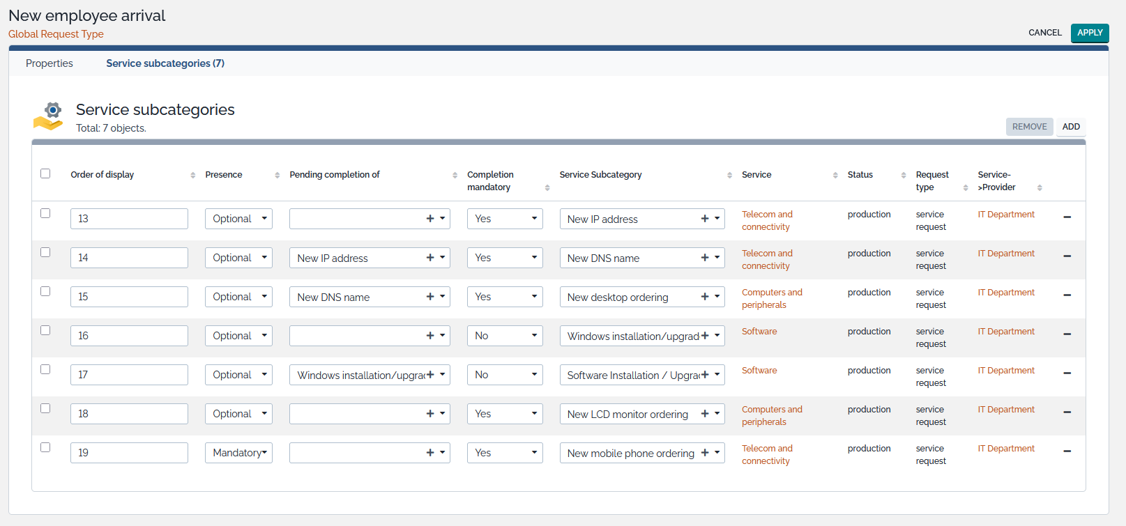 in the brick definition - Add option to set action rules on the unitary requests being created - Add option to preselect all service sub-categories when creating a global request - Add possiblity to add service sub-categories to an existing global request |