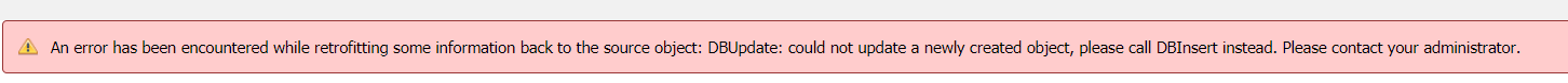 • When a retrofit action is wrong, the retrofit is stopped at that point, the operation completes (object created as expected) and the report contains: “An error has been encountered while retrofitting some information back to the source object: <error message>. Please contact your administrator.”