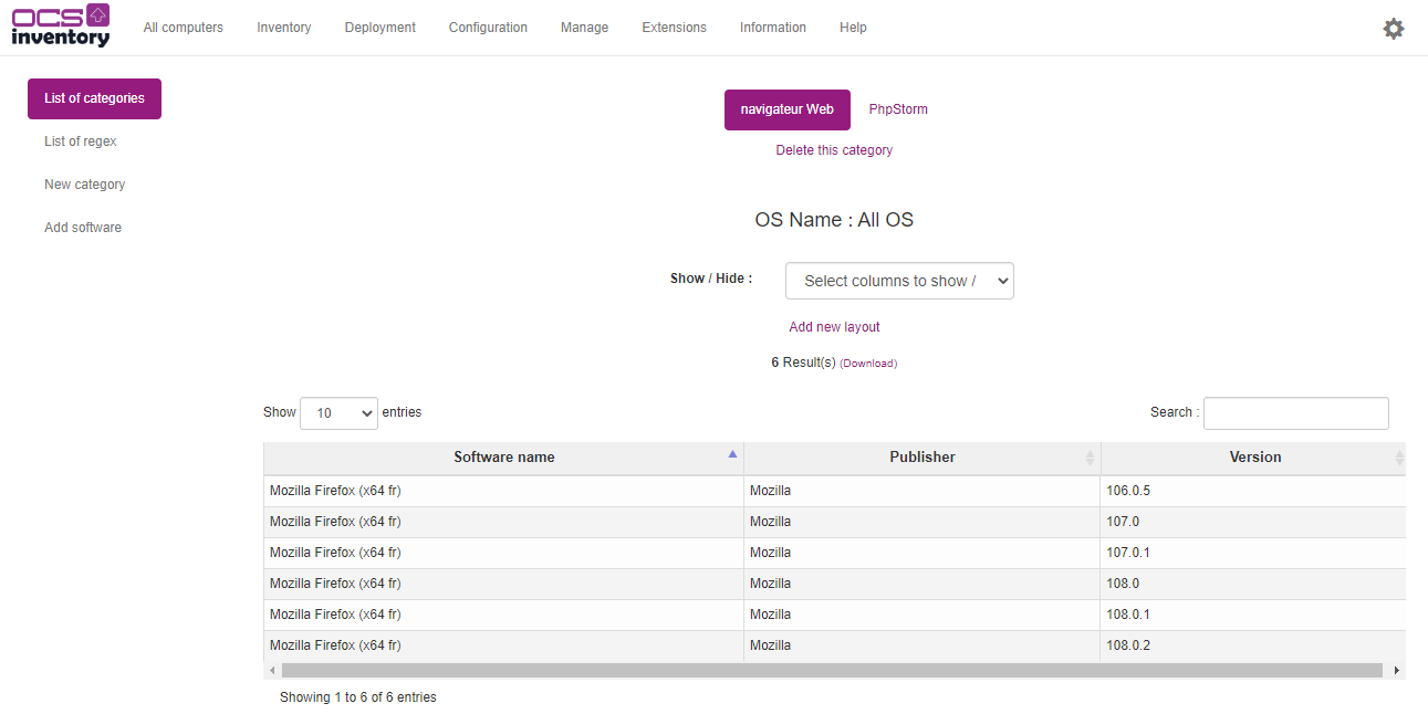 First configure software categories in OCS thanks to Software Category menu below Manage