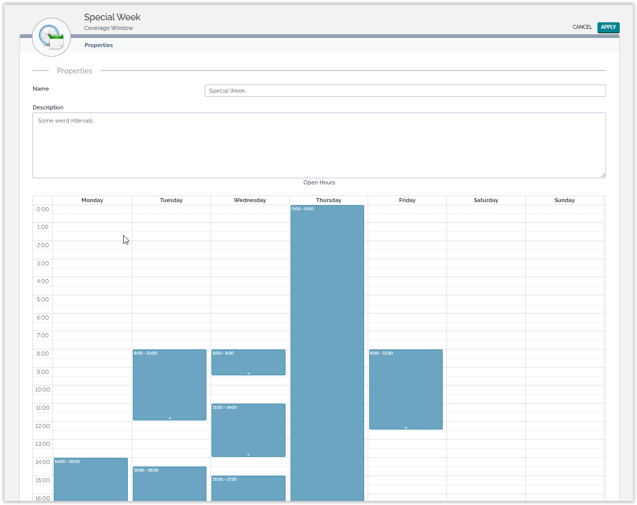 The open hours for a given “Coverage Window” object are represented as a set of intervals, for each day of the week. The area outside of the blue intervals is considered as “Off hours”.