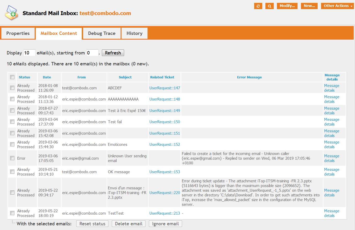 • the configuration setting debug for the module combodo-email-synchro can be set to true in the configuration file. This activates even more traces for all the configured mail inboxes. This additional trace appears only in the output of the cron job.