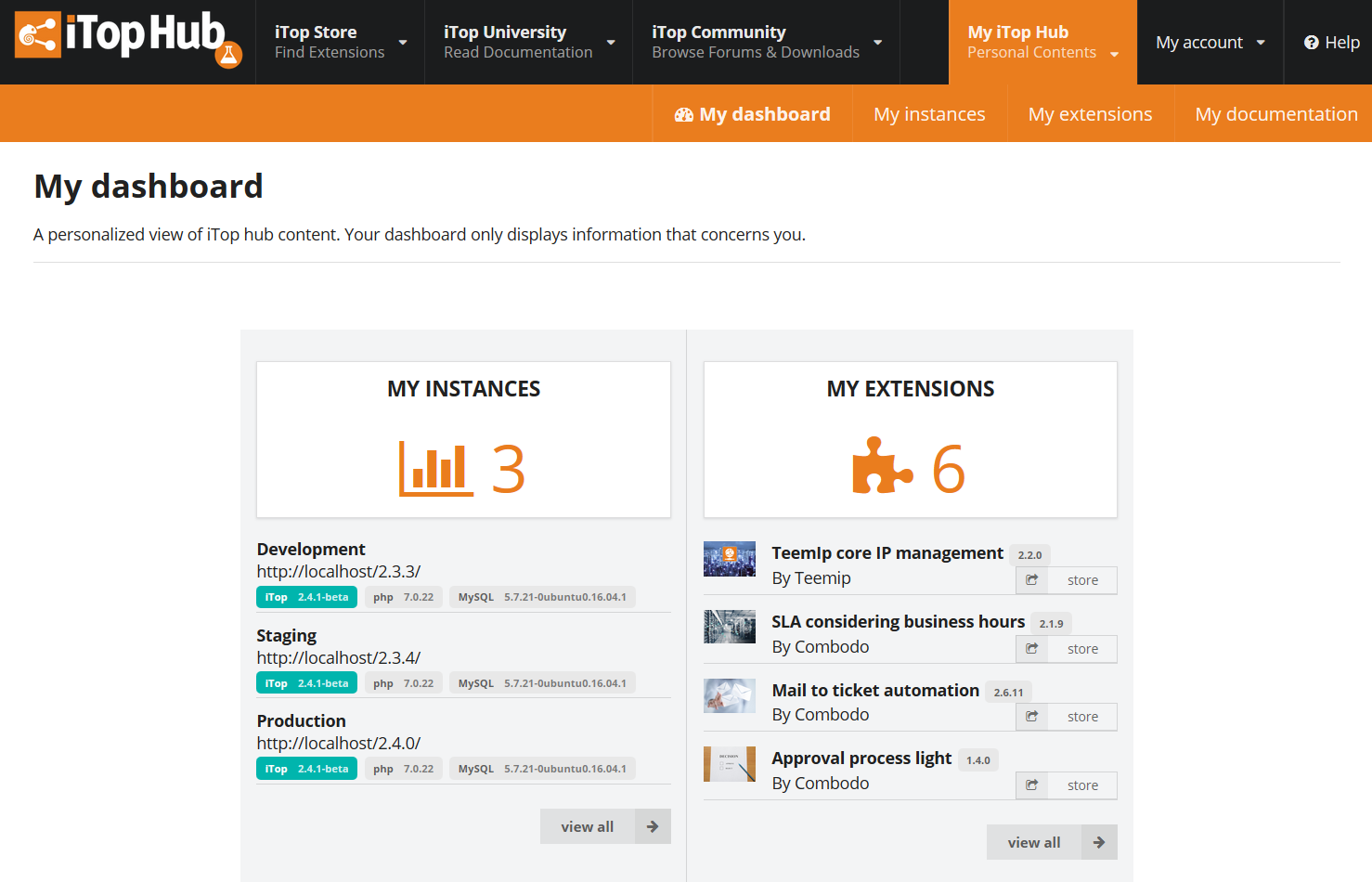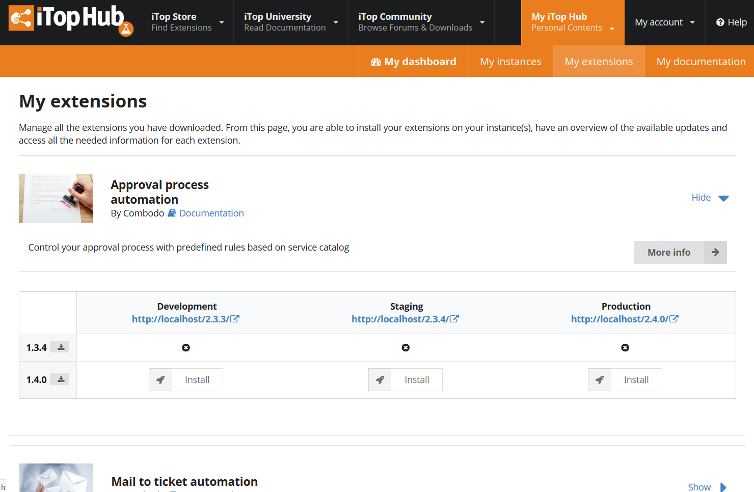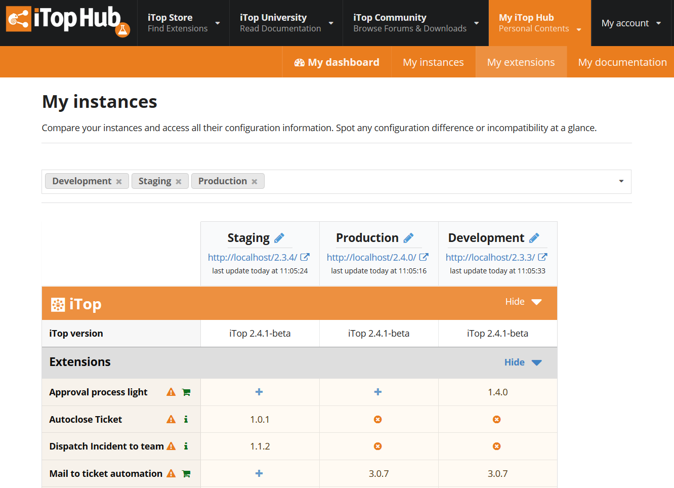 each owned version of this extension and the iTop instances on which they are installed.