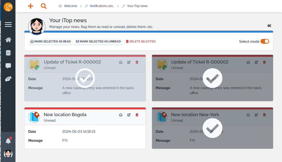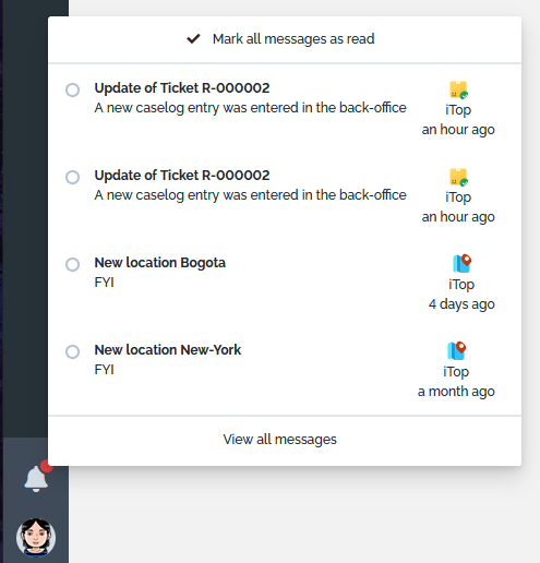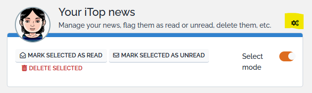 iTop Community Administrators will receive news from 2 different News publisher. The label below the right icon of each message, provides the origin of the message (iTop Hub, iTop or other News publisher).