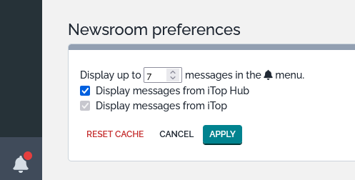 Each source of news can be enabled or disabled in the same user “Preferences” page. There is two sources of news for the Community version: iTop Hub, iTop News.