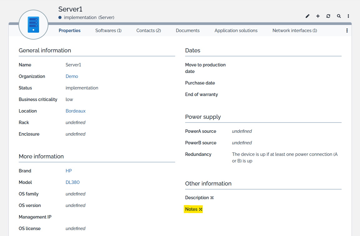 <?xml version="1.0" encoding="UTF-8"?> <itop_design xmlns:xsi="http://www.w3.org/2001/XMLSchema-instance" version="1.0"> <classes> <class id="Server"> <fields> <field id="notes" xsi:type="AttributeText" _delta="define"> <sql>notes</sql> <default_value/> <is_null_allowed>true</is_null_allowed> </field> </fields> <presentation> <details _delta="redefine"> <items> <item id="softwares_list"> <rank>10</rank> </item> <item id="contacts_list"> <rank>20</rank> </item> <item id="documents_list"> <rank>30</rank> </item> <item id="tickets_list"> <rank>40</rank> </item> <item id="physicalinterface_list"> <rank>50</rank> </item> <item id="fiberinterfacelist_list"> <rank>60</rank> </item> <item id="networkdevice_list"> <rank>70</rank> </item> <item id="san_list"> <rank>80</rank> </item> <item id="logicalvolumes_list"> <rank>90</rank> </item> <item id="providercontracts_list"> <rank>100</rank> </item> <item id="services_list"> <rank>110</rank> </item> <item id="col:col1"> <rank>120</rank> <items> <item id="fieldset:Server:baseinfo"> <rank>10</rank> <items> <item id="name"> <rank>10</rank> </item> <item id="org_id"> <rank>20</rank> </item> <item id="status"> <rank>30</rank> </item> <item id="business_criticity"> <rank>40</rank> </item> <item id="location_id"> <rank>50</rank> </item> <item id="rack_id"> <rank>60</rank> </item> <item id="enclosure_id"> <rank>70</rank> </item> </items> </item> <item id="fieldset:Server:moreinfo"> <rank>20</rank> <items> <item id="brand_id"> <rank>10</rank> </item> <item id="model_id"> <rank>20</rank> </item> <item id="osfamily_id"> <rank>30</rank> </item> <item id="osversion_id"> <rank>40</rank> </item> <item id="oslicence_id"> <rank>50</rank> </item> <item id="cpu"> <rank>60</rank> </item> <item id="ram"> <rank>70</rank> </item> <item id="nb_u"> <rank>80</rank> </item> <item id="serialnumber"> <rank>90</rank> </item> <item id="asset_number"> <rank>100</rank> </item> </items> </item> </items> </item> <item id="col:col2"> <rank>130</rank> <items> <item id="fieldset:Server:Date"> <rank>10</rank> <items> <item id="move2production"> <rank>10</rank> </item> <item id="purchase_date"> <rank>20</rank> </item> <item id="end_of_warranty"> <rank>30</rank> </item> </items> </item> <item id="fieldset:Server:otherinfo"> <rank>20</rank> <items> <item id="powerA_id"> <rank>10</rank> </item> <item id="powerB_id"> <rank>20</rank> </item> <item id="description"> <rank>30</rank> </item> <item id="notes"> <rank>40</rank> </item> </items> </item> </items> </item> </items> </details> </presentation> </class> </classes> </itop_design>