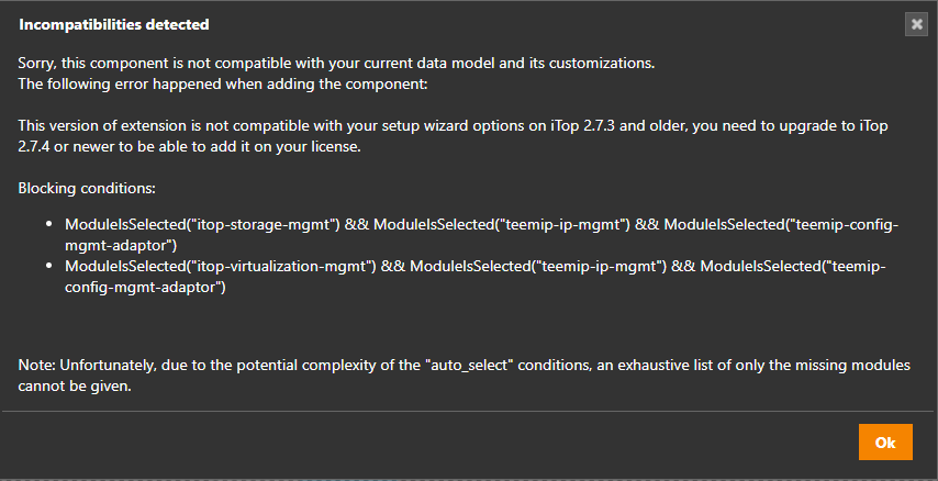But if you upgrade your licence datamodel to 2.7.4+, then add such special extensions relying on auto_select option with dependencies, then connect again to the ITSM Designer with an iTop version older like a 2.7.3 and Change the reference datamodel, then the Move To Production and Move To test will stop with an error message: