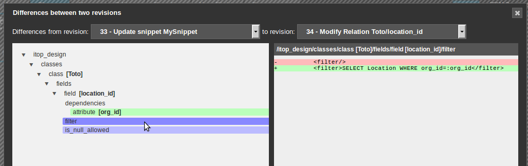 Clicking on the Diff button button, displays a popup dialog showing the XML alterations between the two selected revisions.