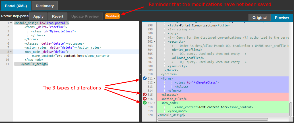 • This tab displays - side by side - the XML alteration to the portal configuration (on the left) and either the original XML or the resulting XML (on the right).